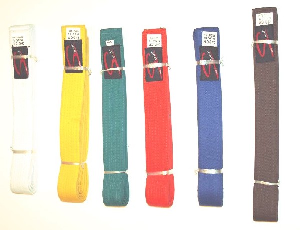 Seis cintos de tecido coloridos alinhados com etiquetas pretas