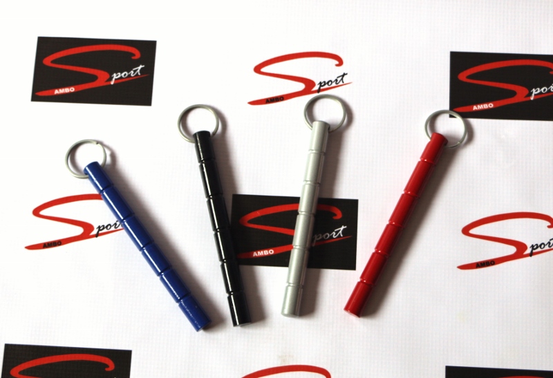 Quatro bastões de autodefesa metalicos coloridos com argola sobre fundo branco com logotipos