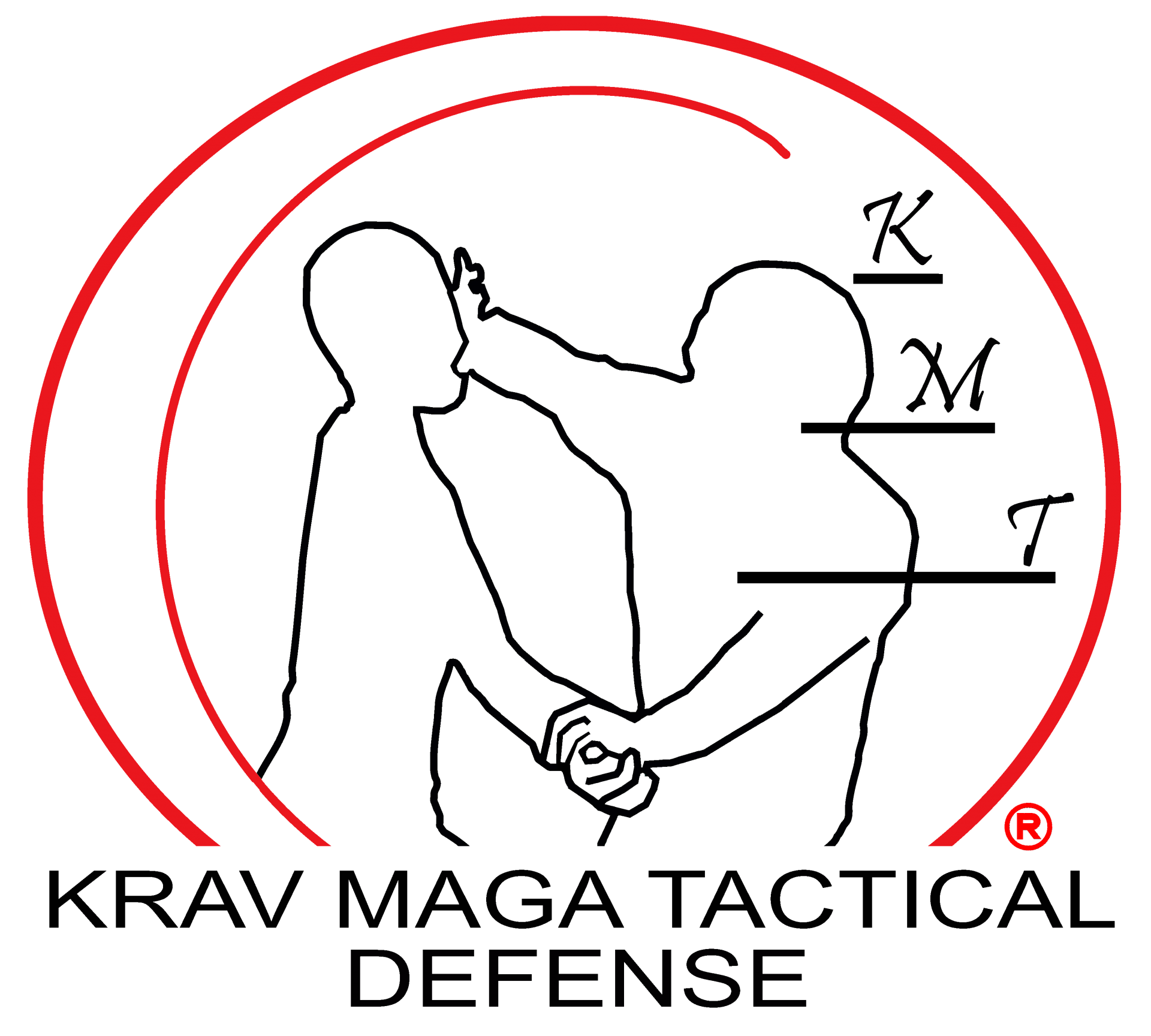 Logótipo de defesa pessoal Krav Maga Tactica com círculos vermelhos e silhuetas a praticar