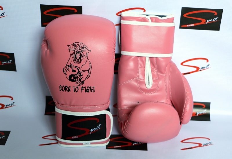 Luvas de boxe cor de rosa com desenho de tigre e texto BORN TO FIGHT