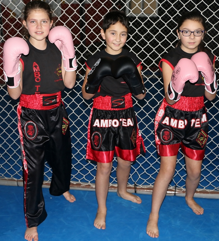 Três crianças com roupa de boxe preta e vermelha e luvas rosas e pretas em piso azul com rede metálica ao fundo