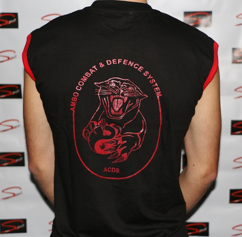 T-shirt preta sem mangas com estampa vermelha de pantera e texto AMBO COMBAT & DEFENCE SYSTEM ACDS