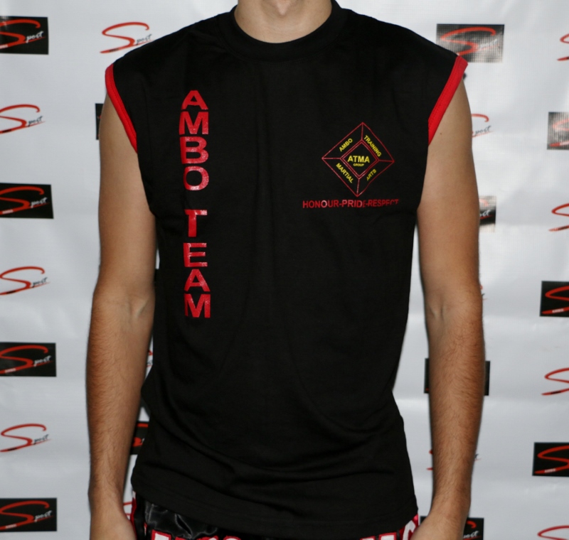 Camisola preta sem mangas com texto vermelho e emblema no peito.