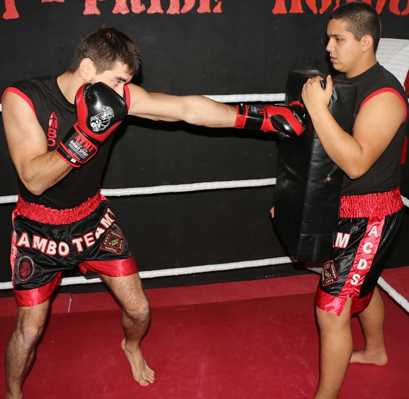 Dois homens em ringue de boxe com roupa de treino preta e vermelha, um com luvas de boxe vermelhas e outro com manoplas pretas.