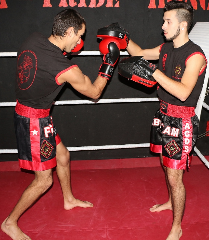 Dois homens a treinar boxe num ringue com calções pretos e vermelhos e equipamentos de treino
